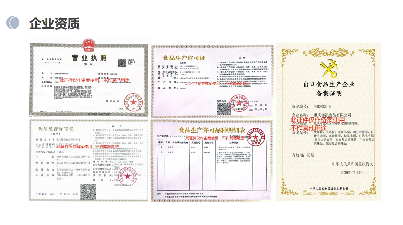 公司先后通過ISO三體系認(rèn)證,知識產(chǎn)權(quán)認(rèn)證,兩化融合A級認(rèn)證,有系統(tǒng)的多層次員工培訓(xùn)體系。2019年成為“示范食品生產(chǎn)企業(yè)”,2020-2023年被授予“區(qū)級農(nóng)業(yè)產(chǎn)業(yè)化龍頭企業(yè)”,2022年獲得高新技術(shù)企業(yè)(證書編號GR202251101662),是重慶江湖菜發(fā)展促進會理事單位,重慶火鍋產(chǎn)業(yè)集團副會長單位,也是重慶輕工職業(yè)學(xué)院共建單位,重慶食品工業(yè)研究所合作單位。